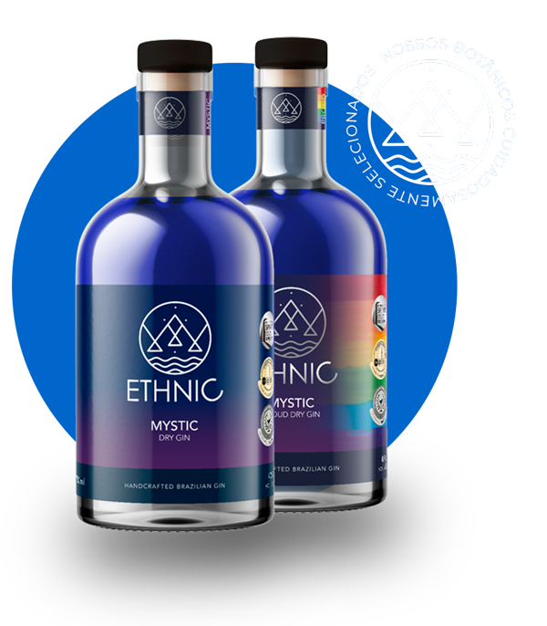 Nasceu então o Gin Ethnic Mystic, um Dry Gin botânico e super aromático, com um sabor leve, porém marcante. Suas notas olfativas florais, herbais e citricas trazem um aroma delicioso e da mesma forma, suas notas gustativas, herbais e cítricas trazem um sabor único. Sua coloração é naturalmente azul e ao ser adicionado tônica, ele muda de cor para o lilás, uma verdadeira alquimia.